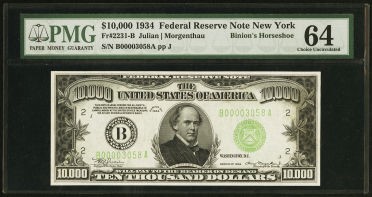 A single choice uncirculated $10,000 1934 Green Seal note, PMG 64, that once greeted gamblers in the entryway to Binion’s Horseshoe Casino in Las Vegas is expected to sell for over 12 times its face value in Heritage Auctions’ Florida United Numismatists Currency Signature Auction’s Platinum Night Jan. 6-12 in Tampa, Florida. The note (est. $125,000) is the fifth and highest-graded bill from the casino’s famed million-dollar display to cross the block at Heritage this year. It will be offered along with over 5,590 lots in a six-day auction spanning Obsoletes, Silver Certificates, Fractional Currency, and National Bank Notes.