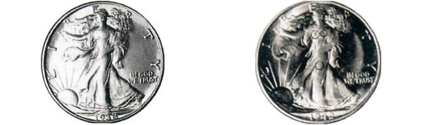 MS-60 and AU-58 Walking Liberty Half Dollars.