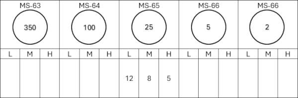 Then, referring to the first chart, I suggest that you would have, at a minimum, 8 piles of coins which would represent the grades of MS-60 to MS-67 (we must realistically expect that there would be no MS-68, 69 or 70 coins in the bag.