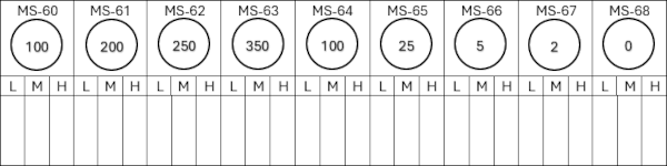 The three columns under each grade represent the Low End (L), the Mid Grade (M) and the High End (H) of that particular grade. Based on this individual grade expansion, you can see that the original 8 piles could, theoretically, expand to as many as 24 piles (8 x 3). You may only have 1 or 2 piles of coins that you feel fall into the MS-66 or 67 category, one a tad better than the other, but the point is, as stated above, there is quality in every grade, and this is reinforced by the second chart below: