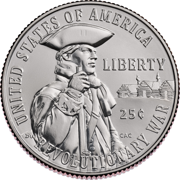 The reverse (Tails) depicts a Continental Army soldier at Valley Forge, Pennsylvania, during the harsh winter encampment of 1777–1778. The design captures the soldier’s resolute determination amid the trials of disease, cold, and the recent defeats, including the Battle of Brandywine. Inscriptions read “UNITED STATES OF AMERICA,” “LIBERTY,” “25¢,” and “REVOLUTIONARY WAR.”